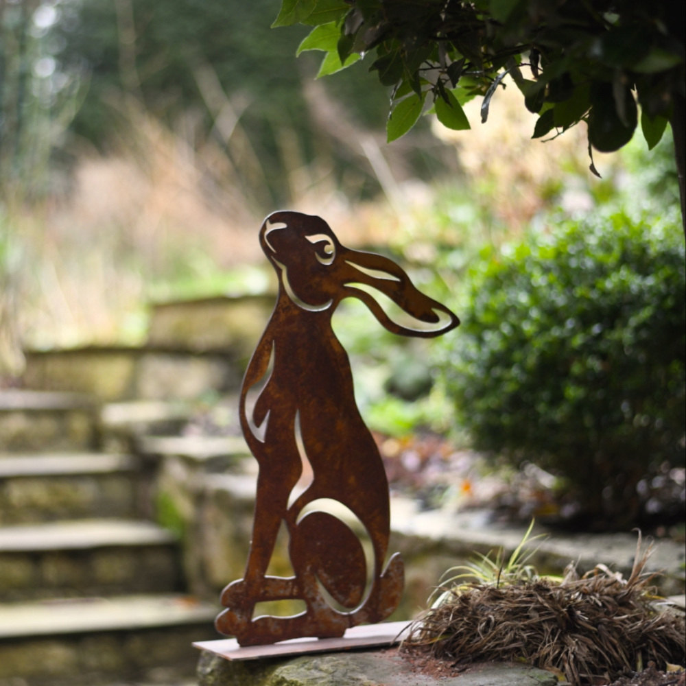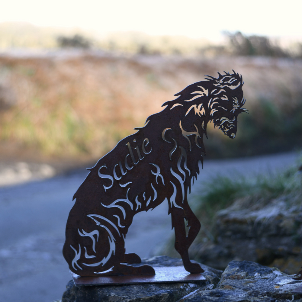 Inspired by art nouveau curves and my love of dogs, this lovely greyhound /whippet will look beautiful anywhere in the house or garden. He is heavy enough to be used as a doorstop, regal enough to sit on top of your gate posts (perhaps one either side?), charming enough to delight all that come across him amongst the flowers in the garden or positioned just as is on the sideboard as a work of art. He is created from thick 3mm mild steel which has been carefully rusted to create a stunning patina and then sealed. He measures approx. 45cm x 24cm not including the metal base. Should you be placing him atop of something outside and need me to include some holes for fixings on the metal base please say so in the comments box at check out, or send me an email with your order no. to helly@hellysart.com