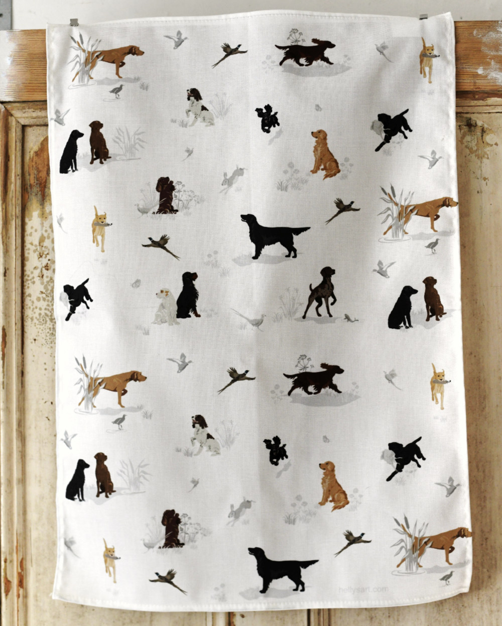 This tea towel tells the story of several happy gundogs out on the hunt or simply enjoying watching nature. You will find many of our much beloved gundog breeds together with an abundance of expressive detail and a fair bit of wildlife too. A classic design with a lot of charm that is perfect for all kitchens. Each tea towel features 13 gundog breeds, is made from high quality cotton, comes with a hanging loop and measures approx. 67 x 42cm.