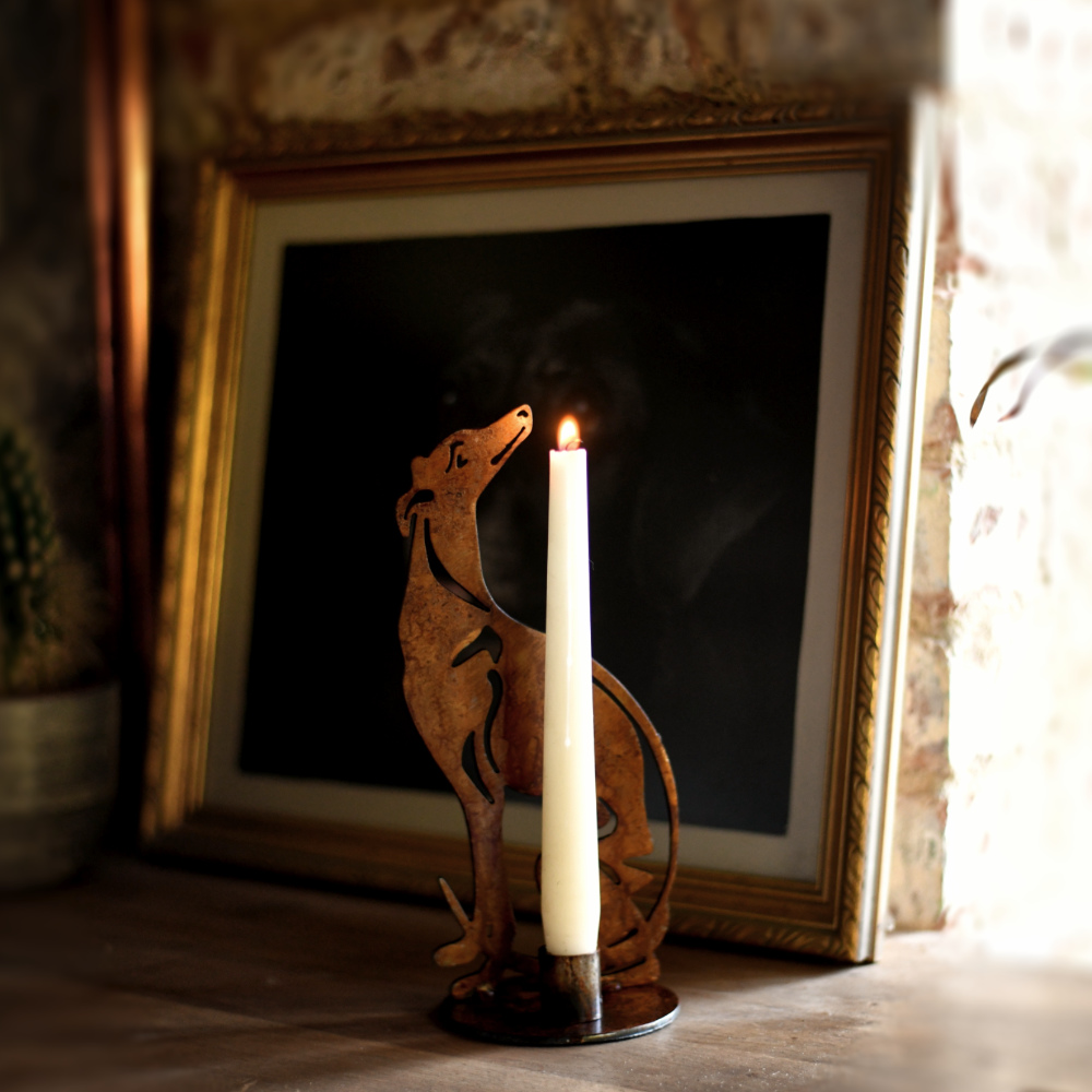 This beautiful greyhound / whippet candle holder stands at a little over 25cm in height. It is designed and created by Helly S from steel, which is carefully rusted then sealed to give a beautiful textured patina. They look wonderful both inside and outside the home.