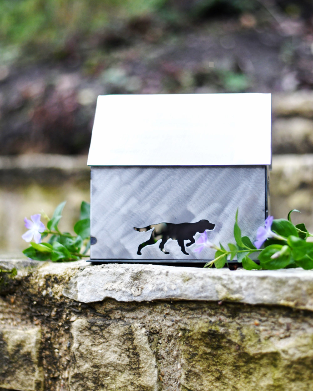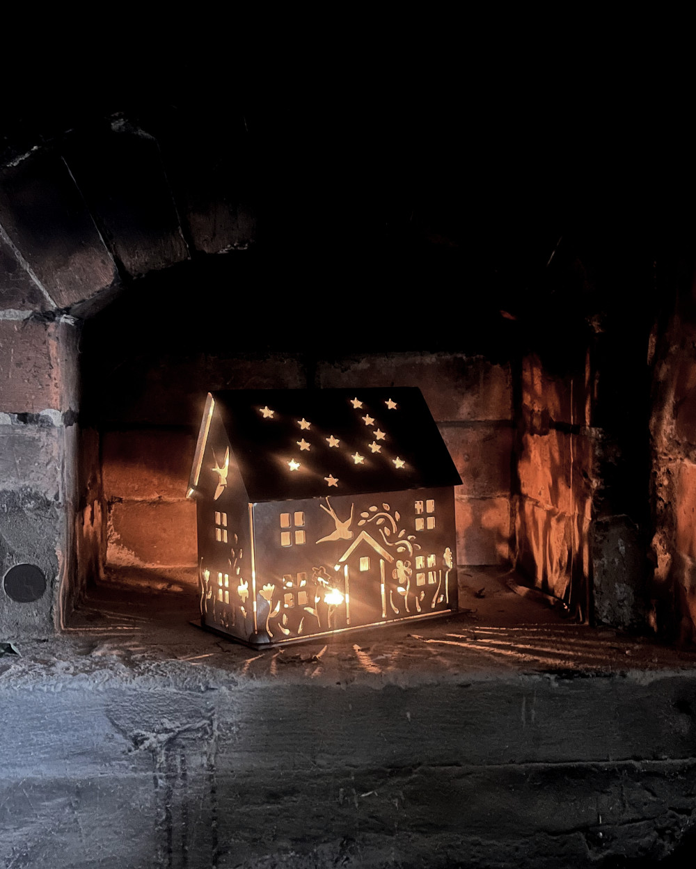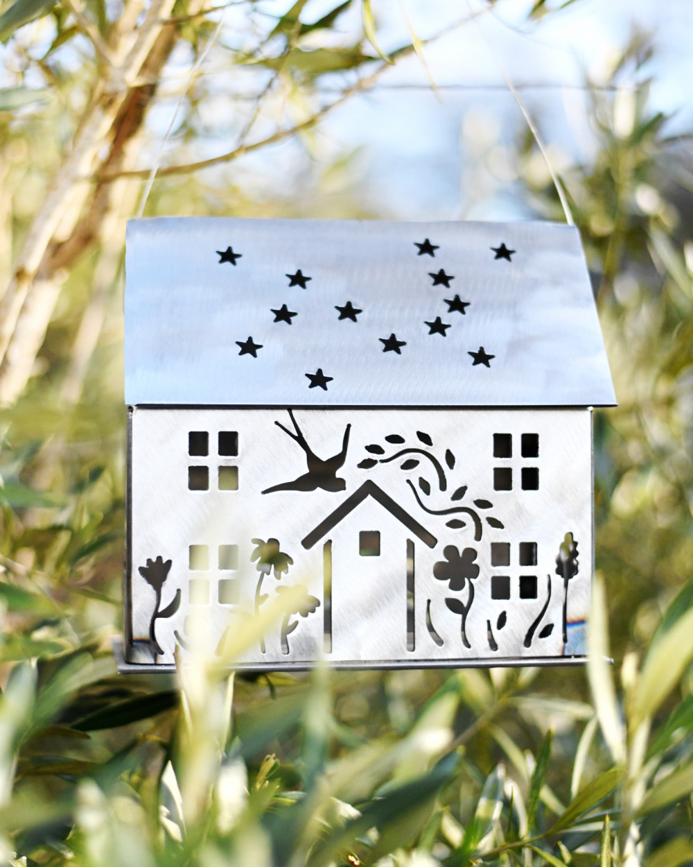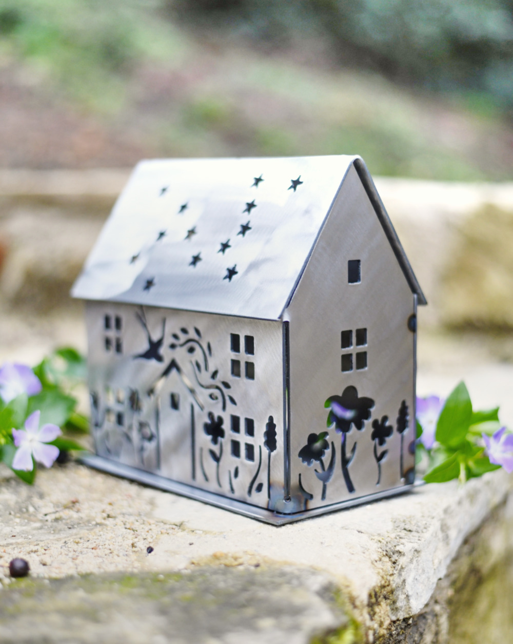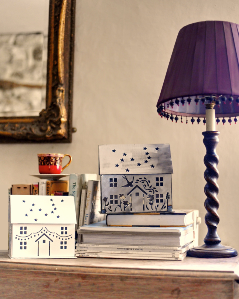 Summer Cottage Lantern. Adorned with flowers, a pair of swallows in love and you choose who or what appears in the back. It might be a favourite dog or cat or a fox or hare…. Made from lovely thick steel and sat on a sturdy felted base, the roof lifts off for the insertion of lights. It can accommodate many tea lights, or a good size candle or two, or my personal favourite – LED string lights (lights not included).Talking of the roof, those stars are the Canis Major constellion, very fitting for animal lovers! This sweet cottage measures 20cm long by 19.5cm high by 10cm wide (about 30% larger than the five Xmas houses). Choose from three finishes – Black, White or Rusted. Suitable for both inside or outdoor use.