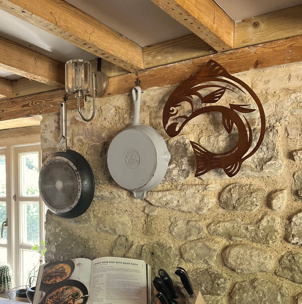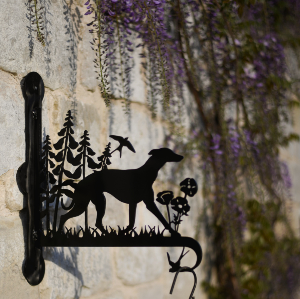 This beautiful sighthound effortlessly moves through a field of wild flowers. So beautiful they are you almost don’t need to hang a basket of plants off it! Should you wish to, this bracket will take 40kg of weight. Hand crafted from thick 3mm steel, this hanging basket measures 33cm wide by 32cm tall and is welded to a 40cm bracket with four holes for screws (fixings not provided).