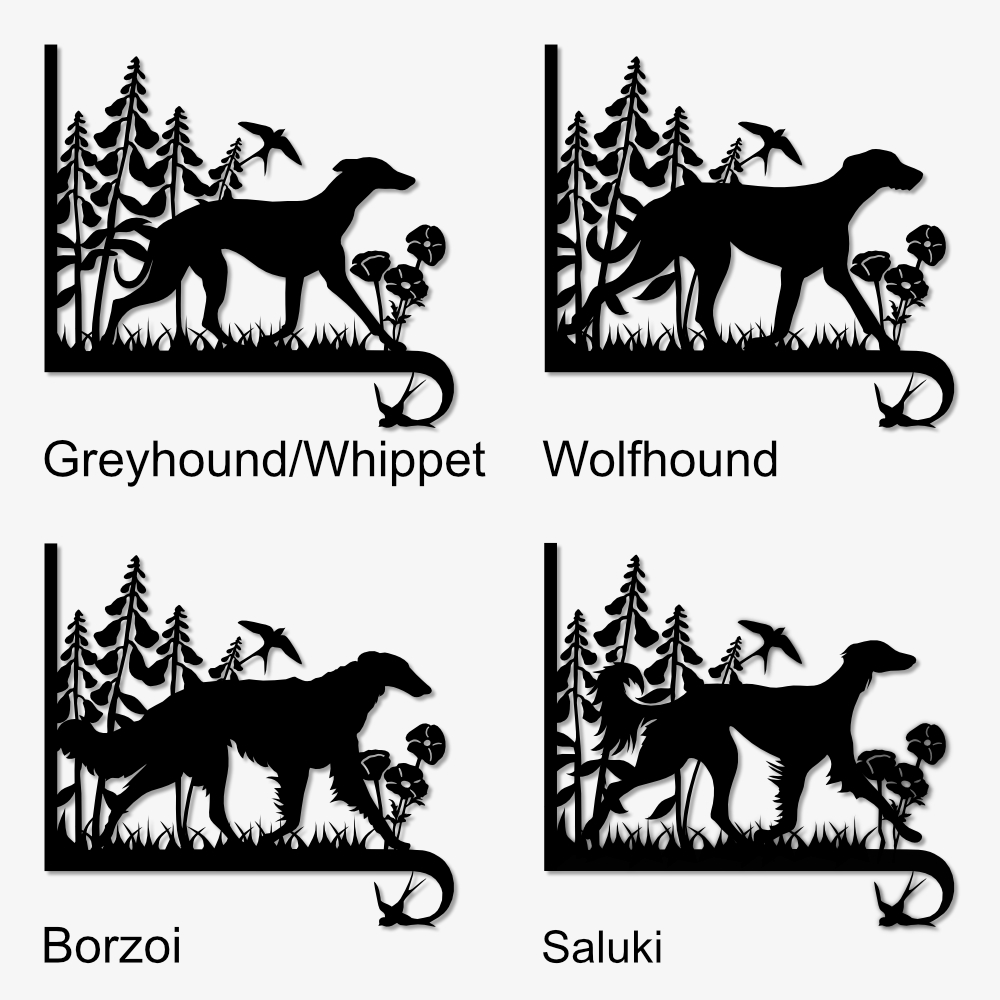 Where Flowers Bloom is available in three finishes – black metal paint, rusted and sealed or powder coated black. Please refer to the photos for more information. Other sighthound breeds my be possible, please email me first.